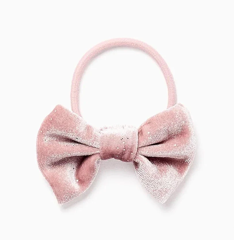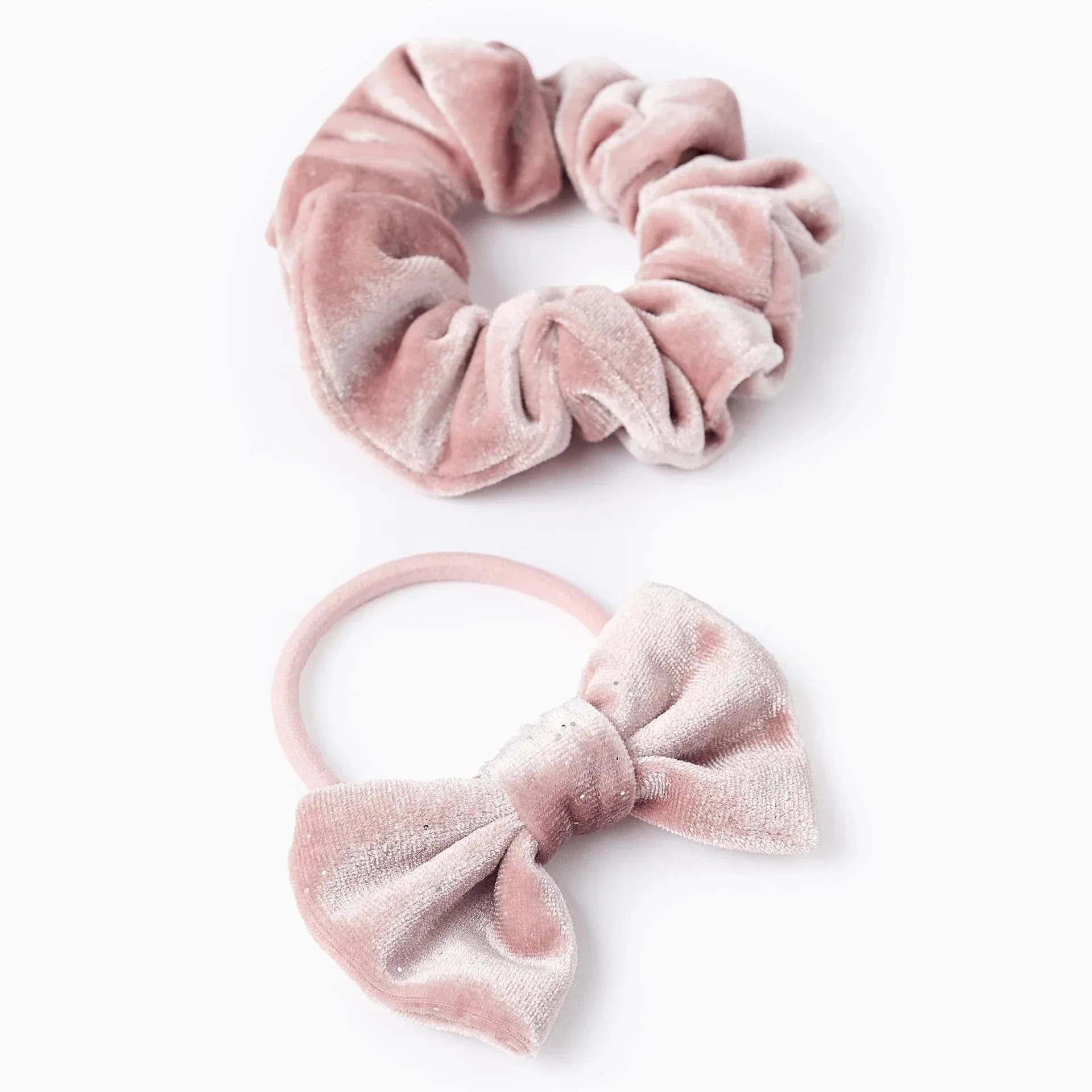 Set de caucho con moño de terciopelo rosa y brillantes, y scrunchie compañera en el mismo material. Ideal para niñas pequeñas con el pelo largo.