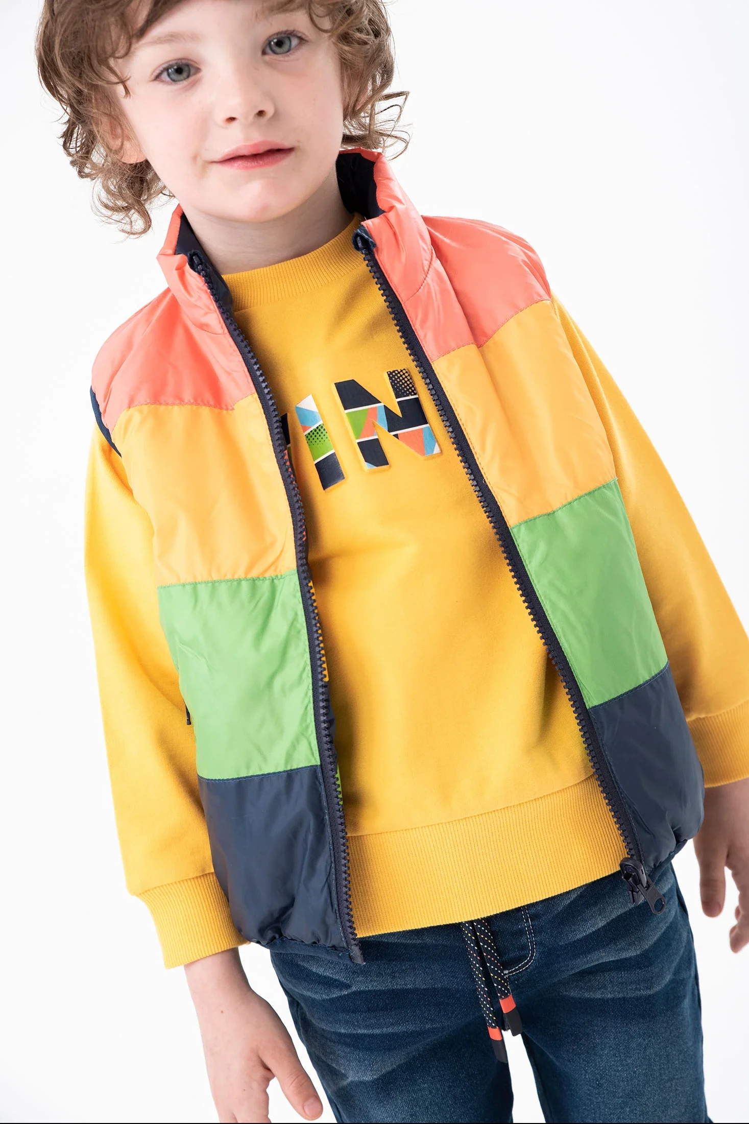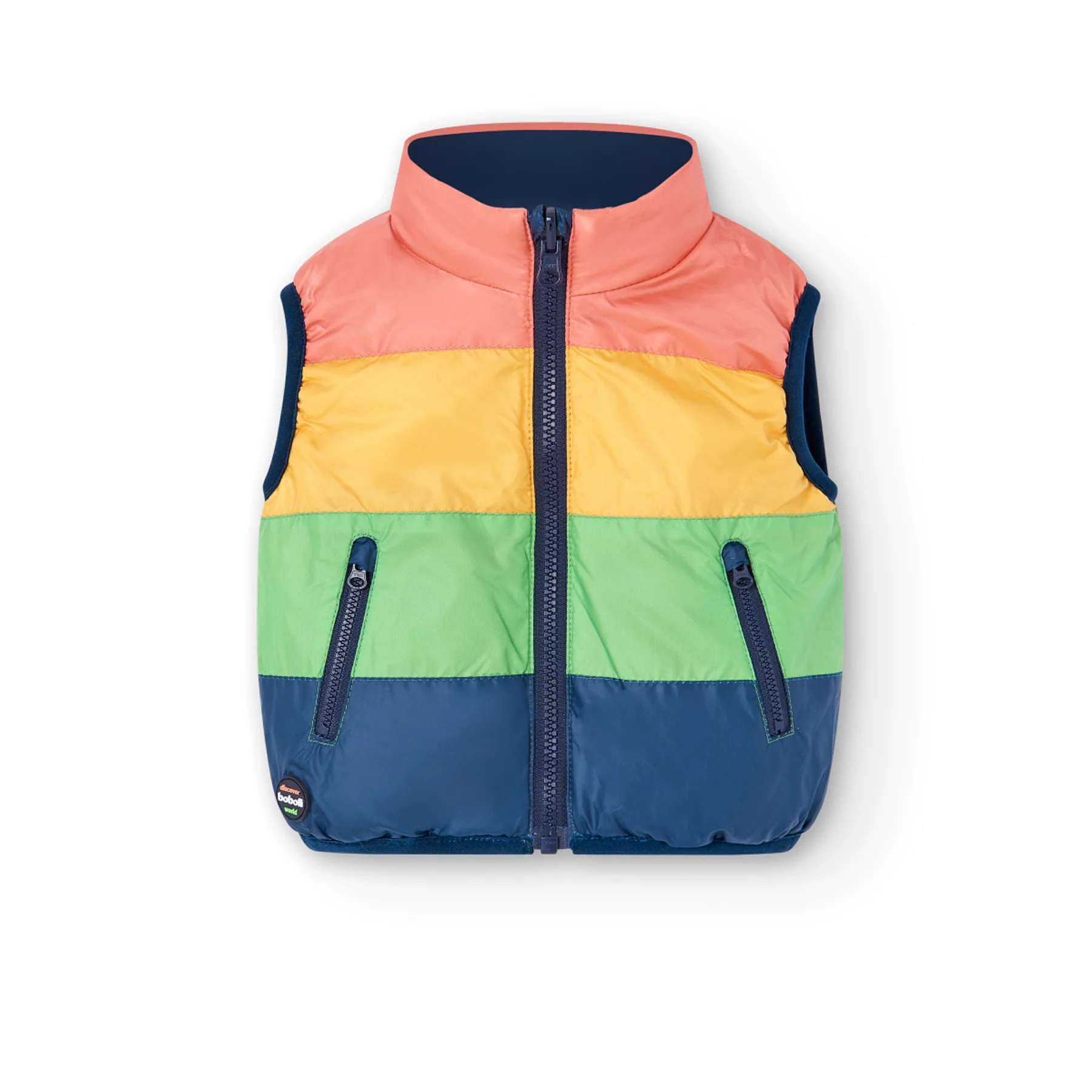 Chaleco reversible en tejido técnico reciclado, con cierre de cremallera al tono. Un lado de tejido técnico es rayas naranja, amarillo, verde y azul, con dos bolsillos laterales con cierre de cremallera; y el otro lado es azul marino con letras. Como decoración tiene una etiqueta decorativa de marca.