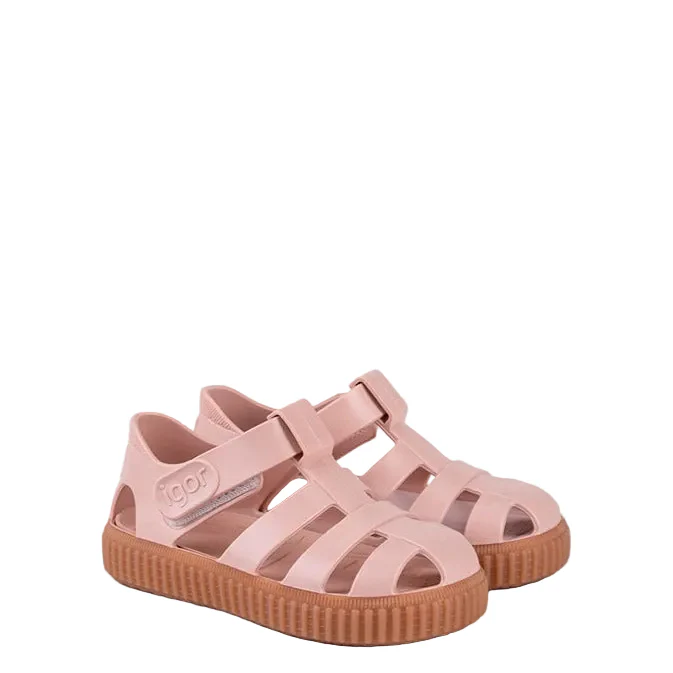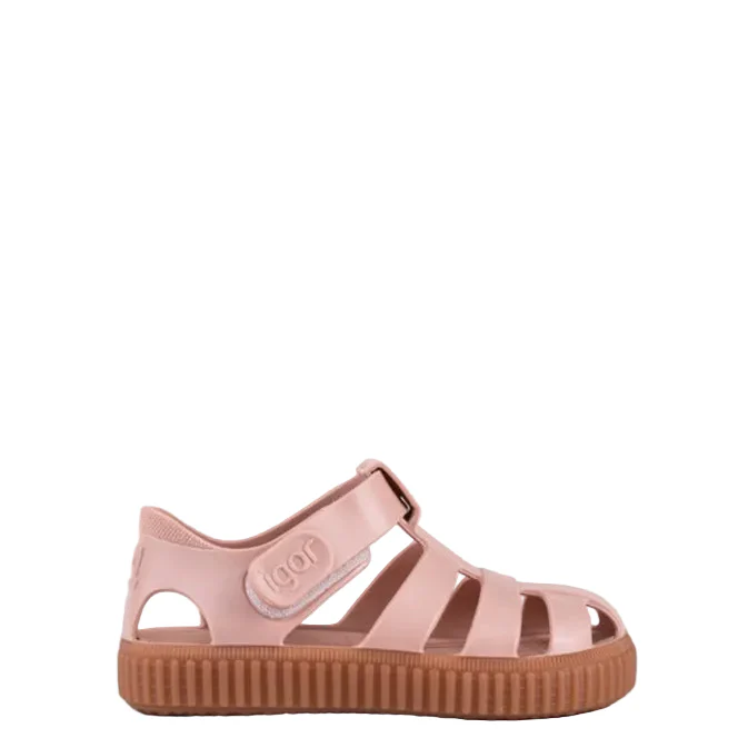 Sandalias deportivas para niños IGOR con acabado mate que combínala con la suela de color caramelo, perfectas para la playa, la piscina o para disfrutar del día a día con total comodidad. Su diseño en PVC inyectado en una sola pieza ofrece resistencia y flexibilidad, mientras que el cierre en velcro al tobillo permite un ajuste fácil y seguro.