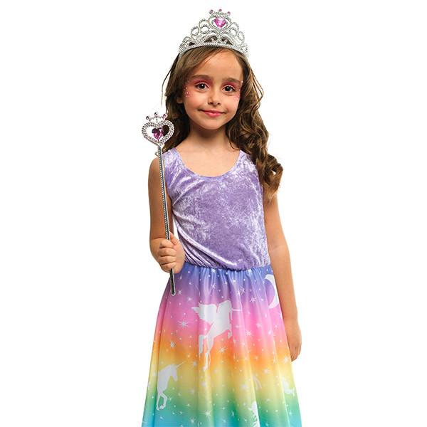 Precioso set para disfrazarte de princesa con varita y corona plateada y rosa.