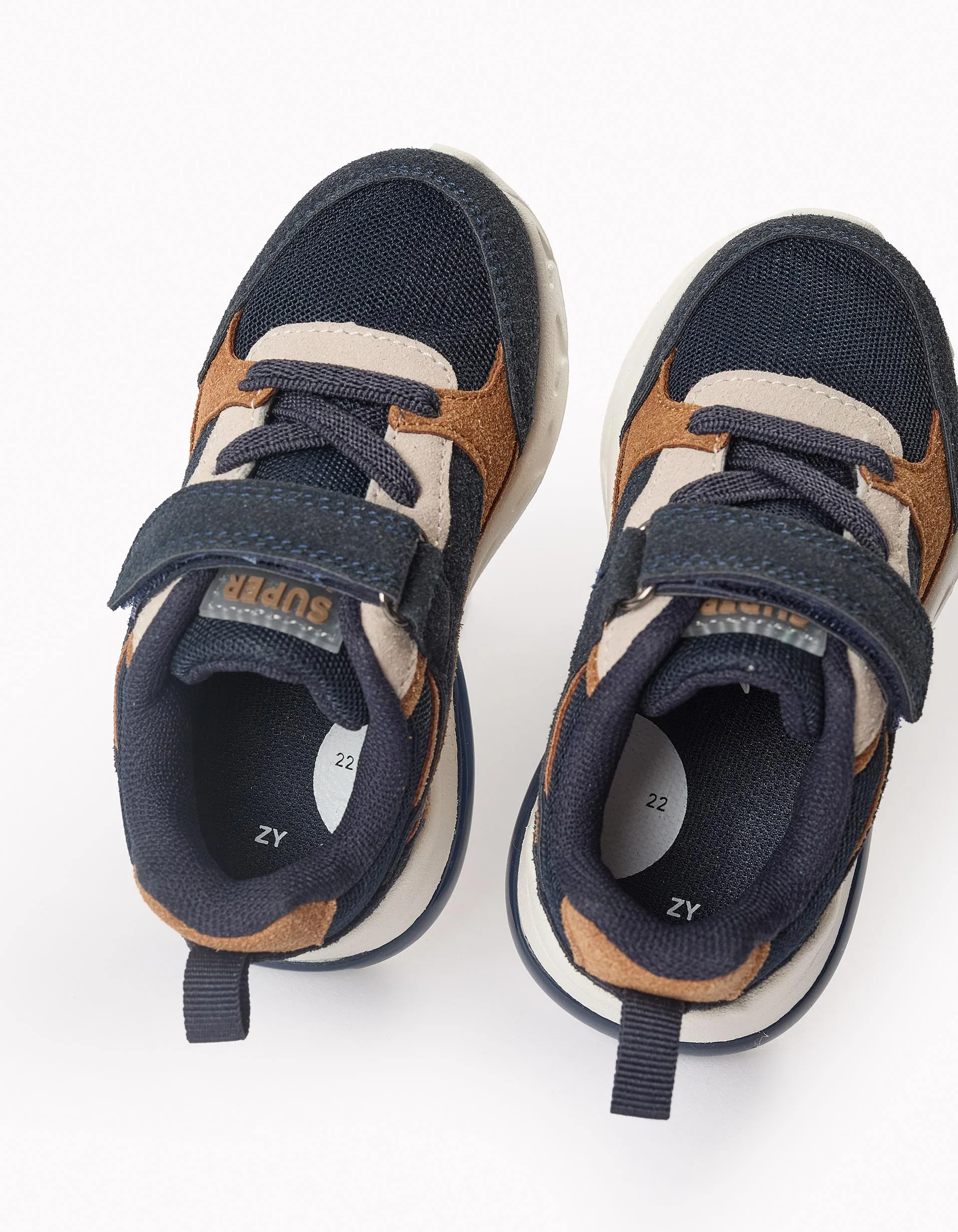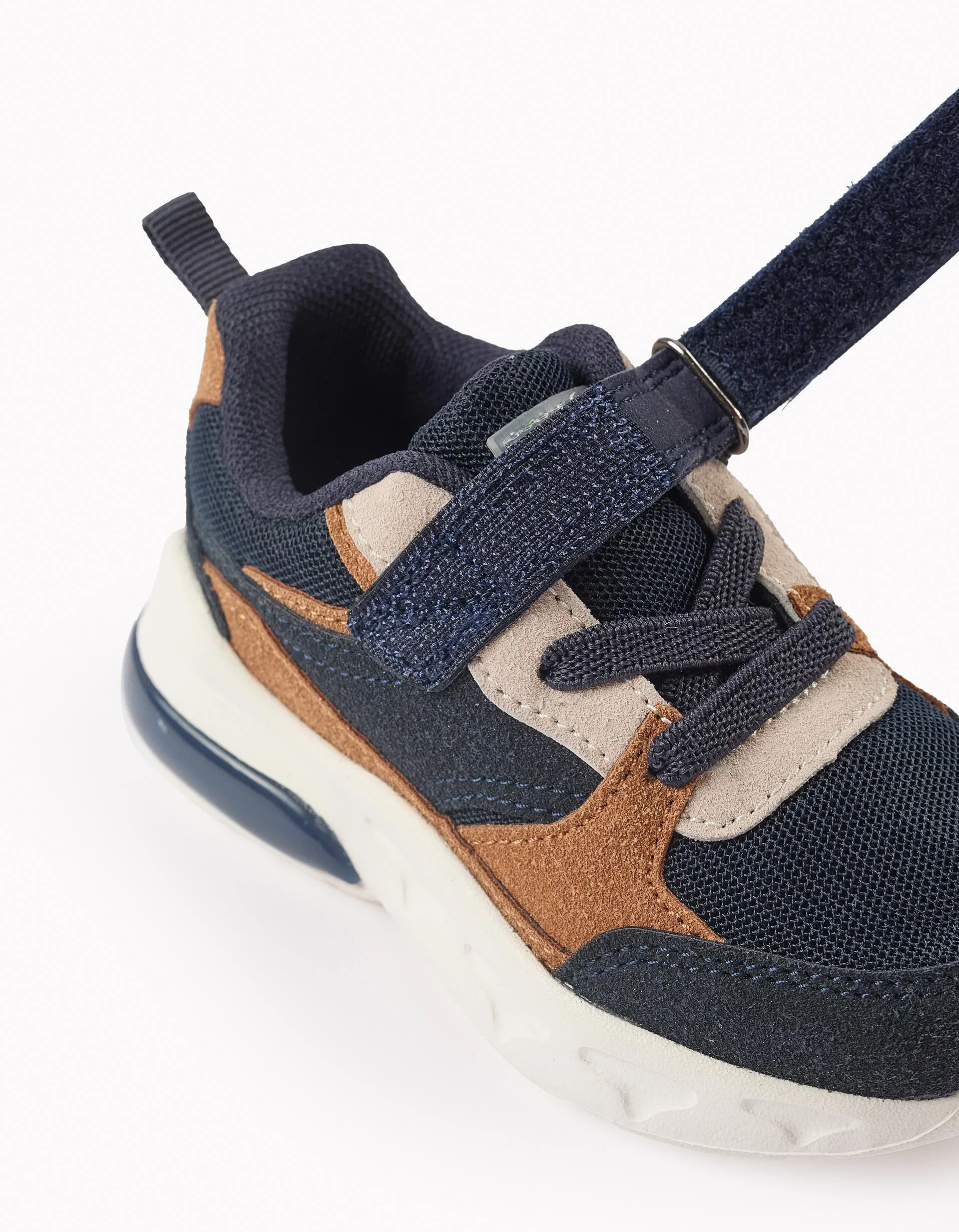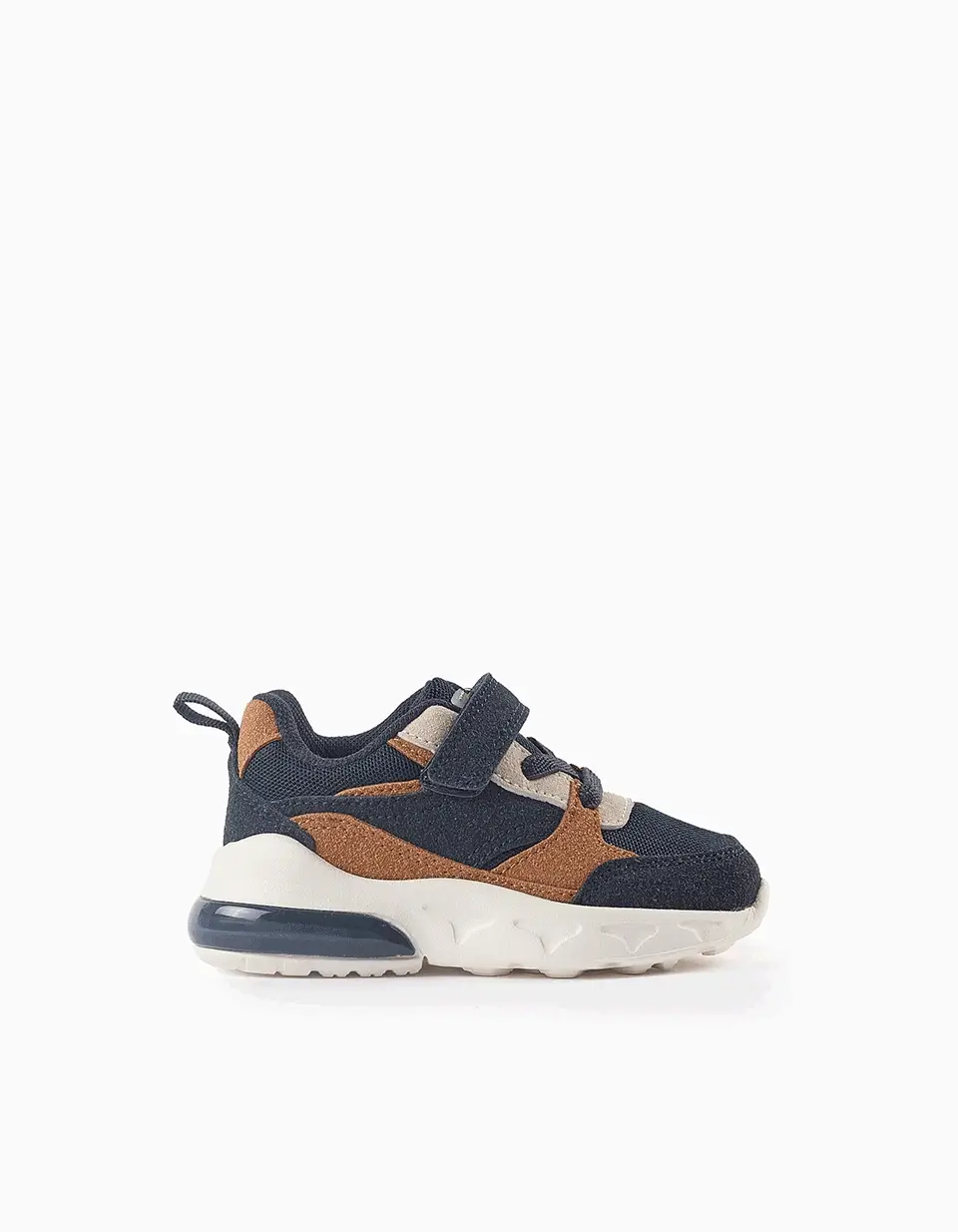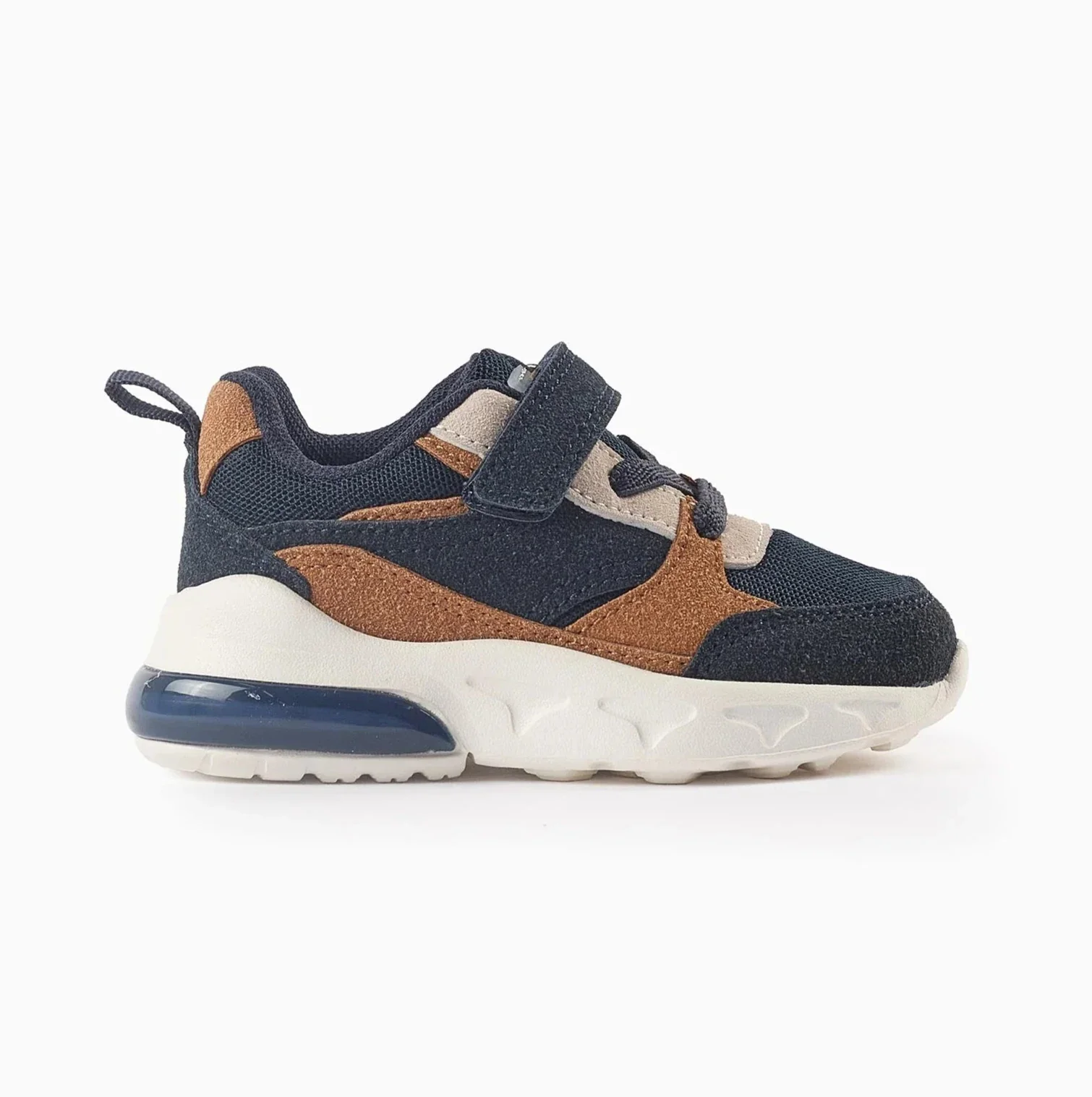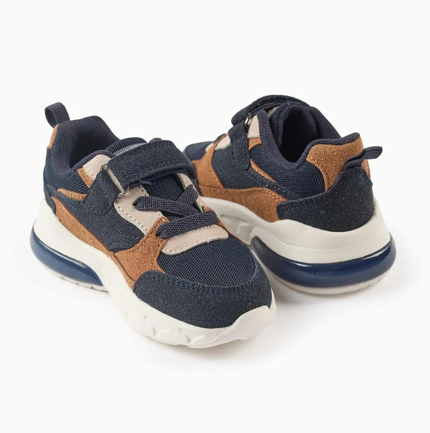 Tennis de piel sintética y malla para bebé niño, en tonos camel y azul oscuro. Cierre táctil y cordones elásticos para un ajuste perfecto.