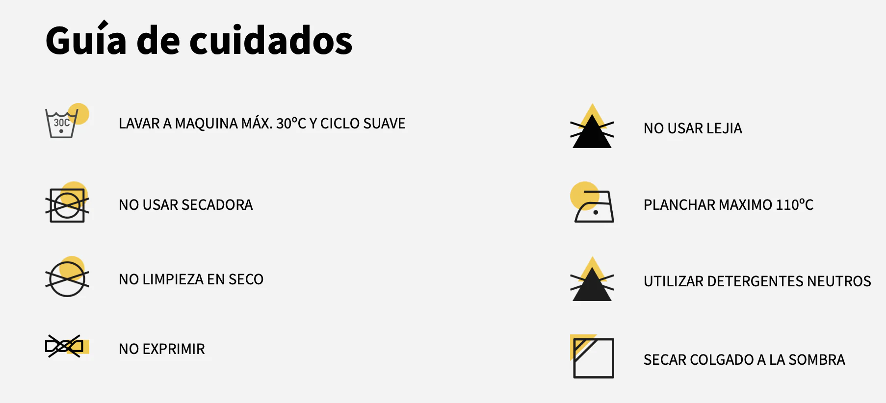 INSTRUCCIONES DE LAVADO: Lavar a máquina en ciclo de delicados, temperatura máxima 30º C. No usar suavizante. No se puede secar con secadora. Planchar a temperatura baja, máximo 110º C. No admite el lavado en seco.