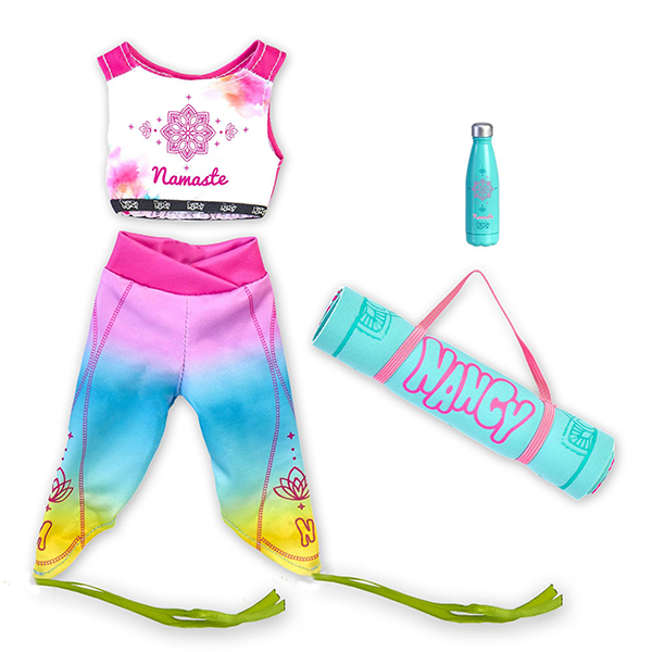 Este conjunto de top y mallas le permite a Nancy ser de lo más flexible mientras va a la moda. Inclye una esterilla y una botella de agua.